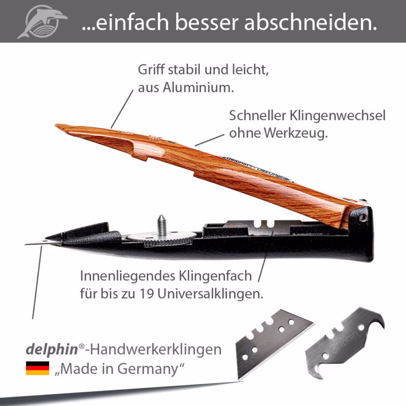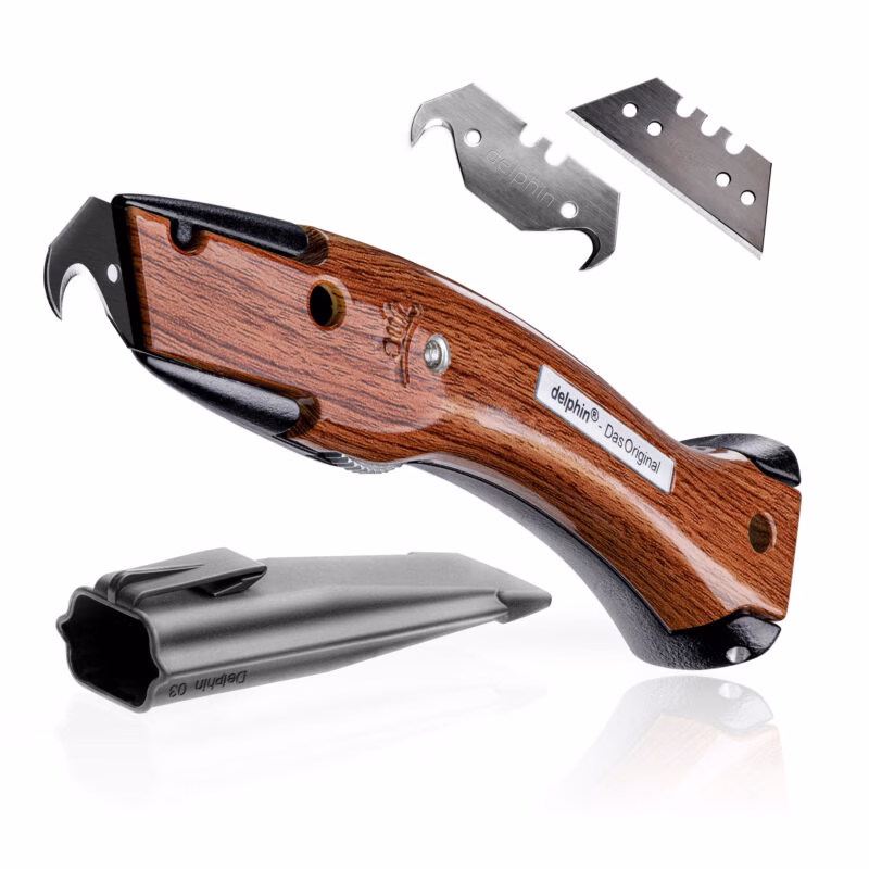Reddig GmbH, have been producing our original Delphin®-03 utility knife. The eye-catching shape of the knife, which also contributed to the name, has become the trademark of our company.The inventor and developer of the knives, Bernd Reddig, was self-employed as a floor layer in his own interior design company at the time when he recognized the need for a new and innovative carpet knife. "This is how a tool is created by the craftsman for the craftsman!"