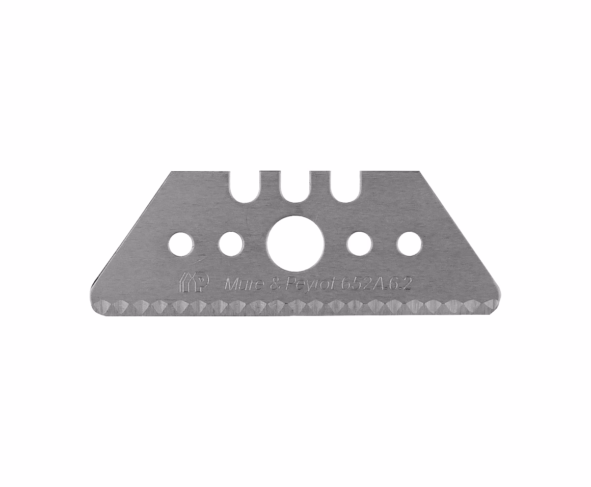 Sahalaitainen terä 652A62, 10 kpl. Leikkaa vähemmällä voimalla ja paremmalla pidolla kuin sileä terä. Sopii kalvoille ja pakkausmateriaaleille.