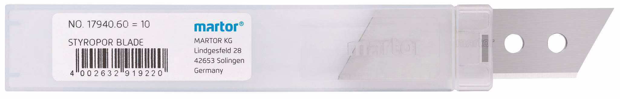 MARTOR Styropor-terä 17940 on ruostumattomasta teräksestä valmistettu erittäin terävä vaihtoterä. Pituus: 71,2 mm. Leveys: 17,7 mm. Paksuus: 0,50 mm