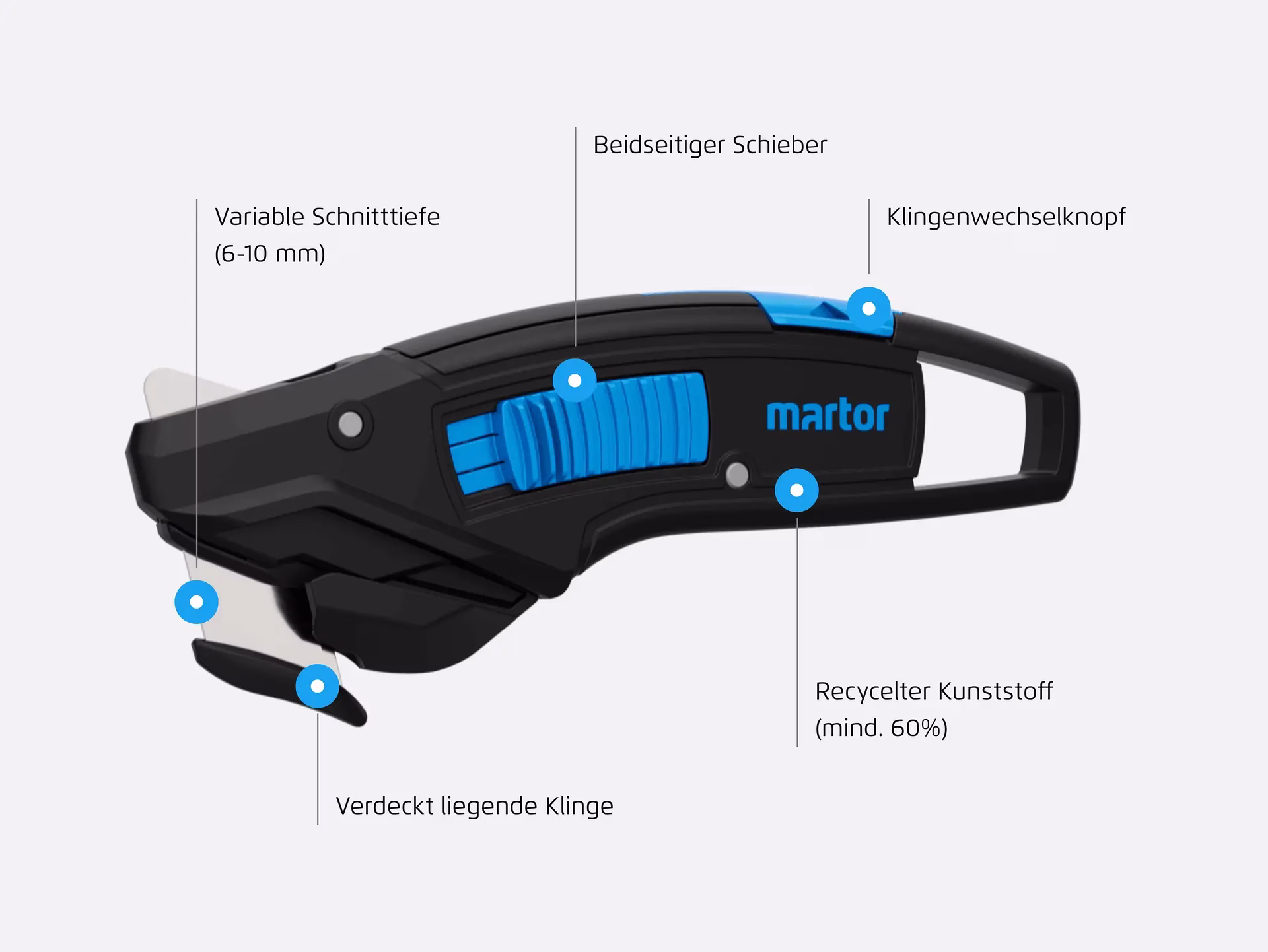 MARTORin SECUMAX 370 on maailman ensimmäinen GS-sertifioitu turvaveitsi, jossa on piilotettu terä ja enimmäisleikkaussyvyys 10 mm. Aiemmat leikkaussyvyydet olivat vain 6–7 mm, mikä ei riittänyt leikkaamaan tehokkaasti esimerkiksi paksua kolmen kerroksen pahvia. Tässä kohtaa MARTORin innovatiivista ratkaisua voidaan soveltaa. Se yhdistää maksimaalisen turvallisuusteknologian säädettävään leikkaussyvyyteen. Lasikuituvahvistettu kahva koostuu vähintään 60 % kierrätetystä muovista.