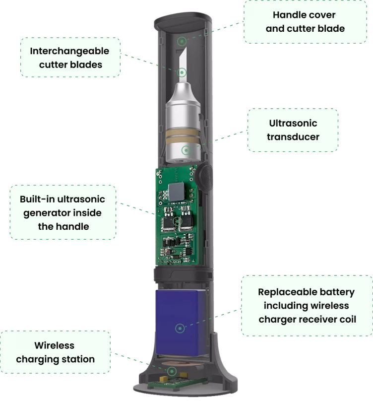 Leikkurimme perustuu ultraääniteknologiaan. Tämän ansiosta leikkuri pystyy värähtelemään terää ennennäkemättömällä nopeudella ja tarkkuudella, tämä vähentää tai poistaa täysin materiaalin tarttumisen terään ja saavutetaan korkeampi terävyystaso ja materiaalien helppo leikkaaminen käy kirjaimellisesti hetkessä. Verrattuna perinteiseen leikkuriin, leikkaaminen on monin verroin helpompaa ja ergonomisempaa.