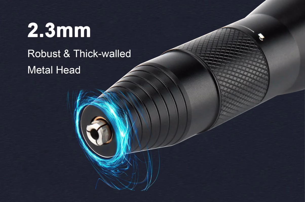 S2-sähköhiomakoneen tarjoaa vertaansa vailla olevan vakauden ja tarkkuuden. Se takaa tarkan kohdistuksen sekä yksityiskohtaisissa poraus- että monimutkaisissa veistotöissä varmistaen virheettömän suorituksen ilman poikkeamia. S2:ssa on kestävä, paksuseinäinen metallipää, joka kestää kulumista ja hapettumista ja helpottaa kärkien vaihtoa.