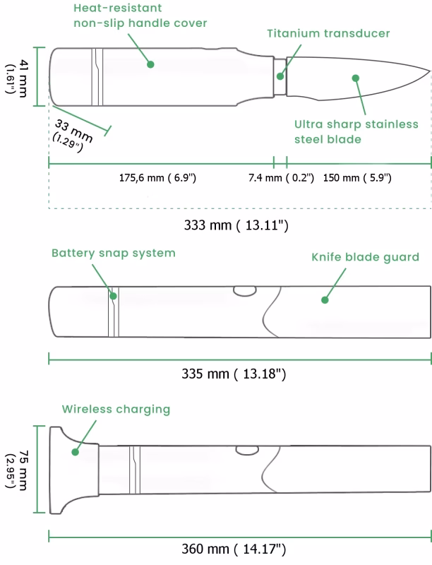 Veitsemme perustuu ultraääniteknologiaan. Tämän ansiosta leikkuri pystyy värähtelemään terää ennennäkemättömällä nopeudella ja tarkkuudella, tämä vähentää tai poistaa täysin materiaalin tarttumisen terään ja saavutetaan korkeampi terävyystaso ja materiaalien helppo leikkaaminen käy kirjaimellisesti hetkessä. Verrattuna perinteiseen veitsiin, leikkaaminen on monin verroin helpompaa ja ergonomisempaa.