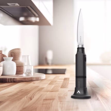Unohda jatkuva pistorasioiden etsiminen tai paristojen vaihtaminen. Veitsemme latautuu langattomasti, mikä takaa mukavuuden ja jatkuvan suorituskyvyn aina kun tarvitset sitä. Langattoman latauksen ansiosta veistä on helppo kuljettaa ja se voidaan helposti asettaa takaisin langattomalle laturille käytön jälkeen. Et ole sidottu virtajohdon pituuteen – voit ottaa veitsen mukaasi minne tahansa, ja työskentelyn jälkeen voit yksinkertaisesti asettaa sen takaisin langattomalle laturille.
